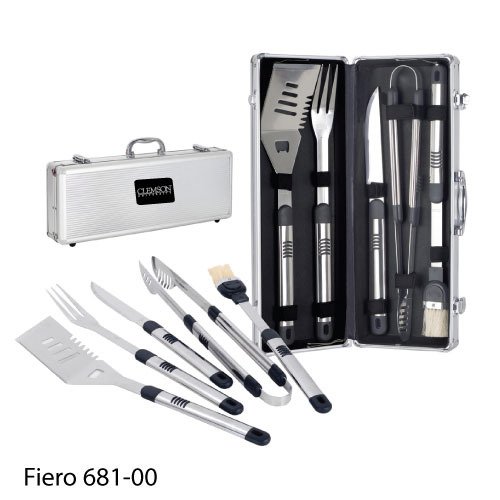 The Fiero Set from our Platinum Collection contains the essentials you'll need to prepare a phenomenal barbeque feast. The Fiero 5 Piece Barbeque Set features an attractive aluminum carrying case with comfort-grip handle, large eyelets allow you to hang the BBQ tools, faux leather interior and elastic-reinforced hook and loop closures to keep tools secure. Includes: 1 Extra large stainless steel spatula with serrated edge and built-in bottle opener, 1 Large stainless steel BBQ fork, 1 Large stainless steel BBQ knife, 1 Stainless steel tongs, 1 Basting brush. Color: Black. Decoration: Laser Engraving.